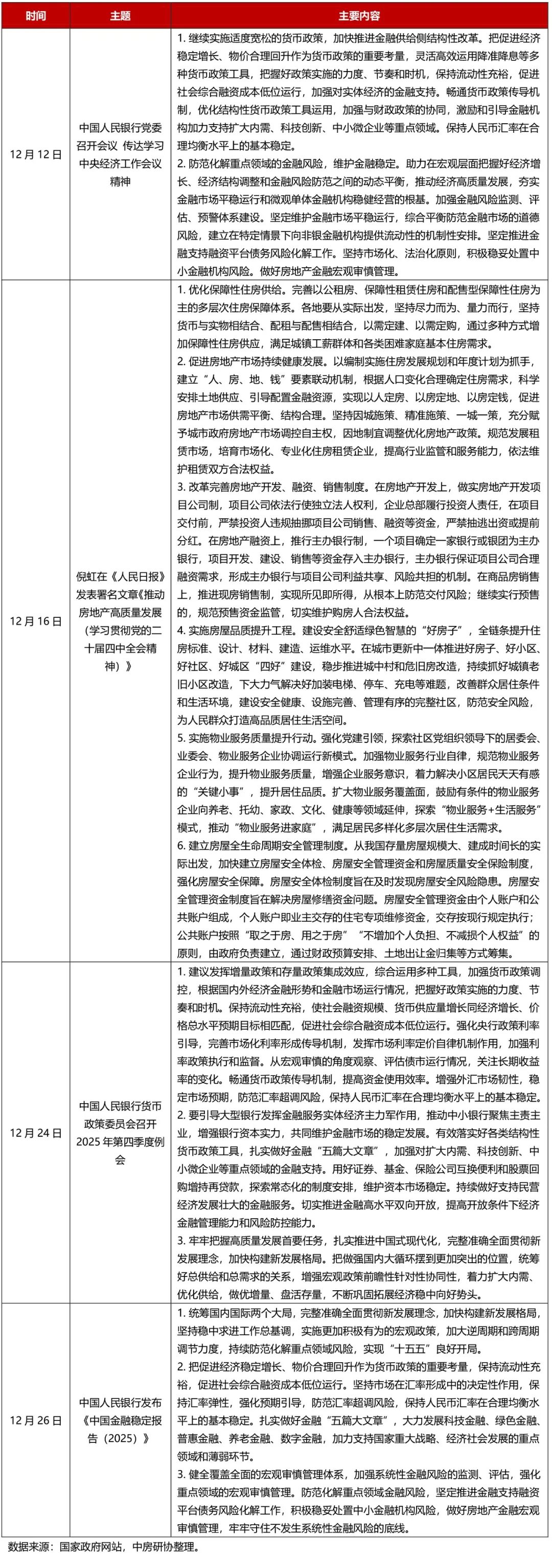 12月24日,中国人民银行货币政策委员会召开2025年第四季度例会。会议指出,当前外部环境变化影响加深,世界经济增长动能不足,贸易壁垒增多,主要经济体经济表现有所分化,通胀走势和货币政策调整存在不确定性。我国经济运行总体平稳、稳中有进,高质量发展取得新成效,但仍面临供强需弱矛盾突出等问题和挑战。要继续实施适度宽松的货币政策,加大逆周期和跨周期调节力度,更好发挥货币政策工具的总量和结构双重功能,加强货币财政政策协同配合,促进经济稳定增长和物价合理回升。短期流动性方面,财政因素以及居民、企业部门的集中取现需求可能会对1月资金面带来一定扰动,预计中国人民银行仍将通过MLF、买断式和质押式逆回购等多种政策工具保持流动性充裕,1月资金面或延续较宽松态势。